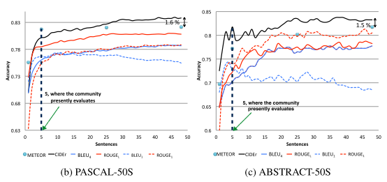 - 평가에 사용되는 Reference 문장의 개수가 많아질 수록 CIDEr, ROUGE는 ACC가 증가한다.