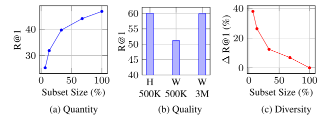 - (c)는 데이터의 크기가 제한적일 때, 이미지-텍스트 쌍을 균일하게 샘플링(100%)하는 것보다 다양하게 샘플링하는 것이 더 향상된다는 것을 보여준다.