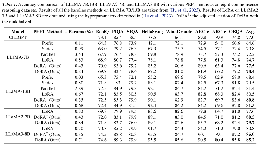 - DoRA는 다양한 PEFT 방법들과 비교했을 때 좋은 성능을 보여준다.