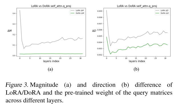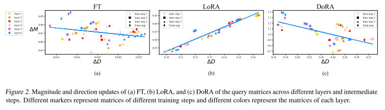 - Figure 2.의 (c)에서 DoRA는 FT와 유사하게 음의 기울기를 보인다.