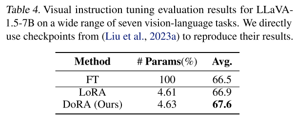 - DoRA는 NLP부터 Vision-Language 벤치마크까지 다양한 태스크에서 LoRA를 능가하는 성능을 보였다.