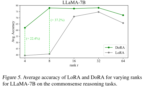 - r이 작을 때(4, 8)는 DoRA가 LoRA에 비해 성능 향상 폭이 크고, r이 커질수록 성능 향상 폭이 작아진다.