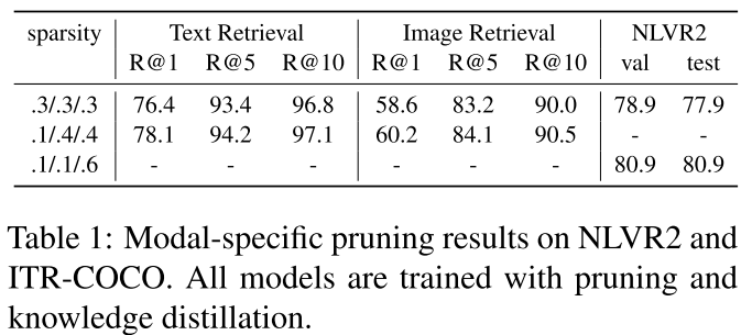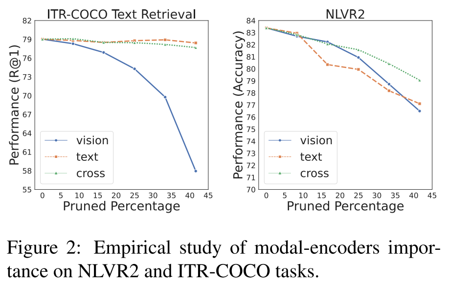 - NLVR2에서는 VIsion Encoder, Text Encoder의 Pruning 비율을 낮추고 Cross-Modal Encoder의 Pruning 비율을 높인 것이 효과가 더 좋다.