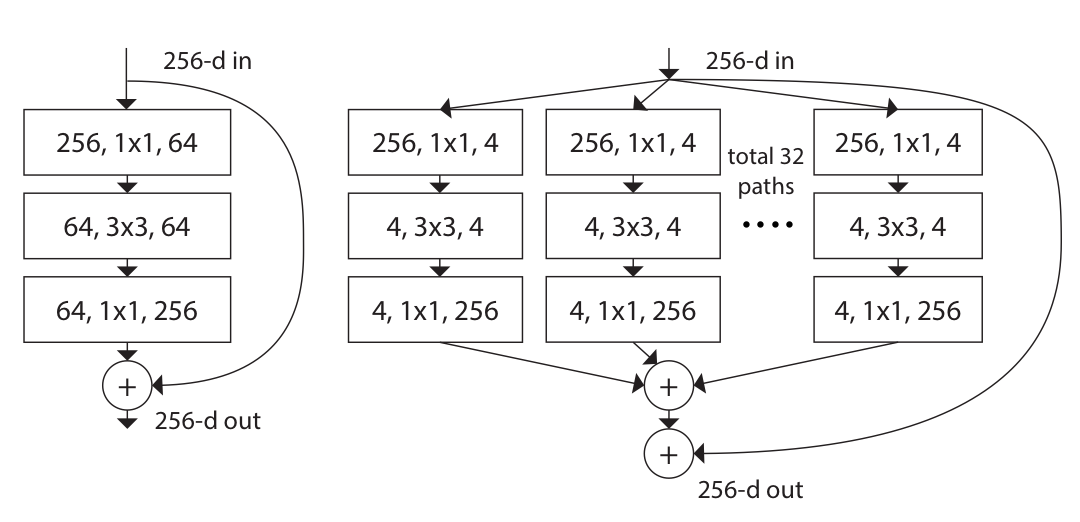 기존 모델에 비해 간단하고 효율적인 모델이다. ResNet block을 inception과 비슷한 ResNeXt module로 교체하였다. ResNet과 비슷한 깊이를 가지지만 hyper parameter의 개수는 더 적고 정확도는 증가시켰다.
