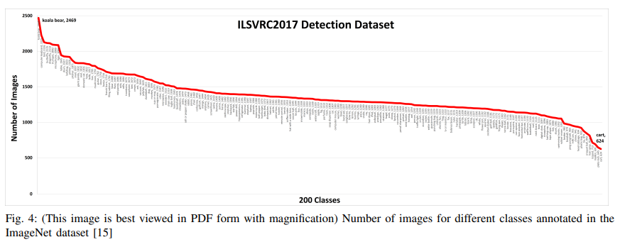 위에서 소개한 4개의 데이터셋 중 ImageNet을 제외한 Pascal VOC, MS-COCO, Open Image 3가지 데이터셋은 약 상위 5개의 클래스에서 분포가 현저히 감소하는 양상을 확인할 수 있다. Pascal VOC에서 ‘person’이 13775개로 가장 많이 등장했고, ‘sheep’이 552개로 제일 적게 등장했다. 다른 데이터셋에서도 마찬가지로 Skew(기울어짐)/Bias(편향)을 확인할 수 있다. Skewed dataset으로 학습된 모델은 당연하게도 이미지 수가 적은 부류보다 많은 부류에 대해 더 높은 정확도를 보일 것이다. 그나마 ImageNet은 Skew/Bias의 정도가 크지 않지만, 상위에 분포한 클래스들이 ‘koala’, ‘computer keyboard’ 등 실생활 object detecion(person, cars, traffic sign 등)에 관련성이 크지 않다는 문제가 있다.