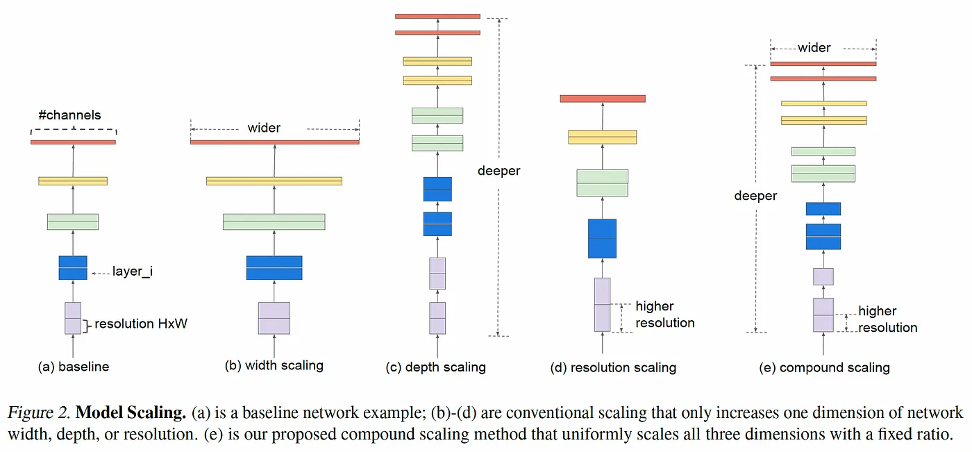 EfficientNet은 depth, width, resolution의 scale을 조절한다. 모델의 depth를 증가시키면 더욱 복잡한 특징을 추출할 수 있지만 가중치 소멸 문제가 발생할 수 있다. 반면 모델의 width(channel)를 증가시키면 find-grained 특징을 추출할 수 있지만 고수준 특징은 추출하기 어렵다. Depth, with와 마찬가지로 resolution을 증가시키는 것은 모델이 포화될 수 있다. EfficientNet은 이 3가지의 적당한 타협점을 찾아내도록 한다.