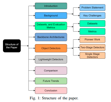 Introduction → Background → Datasets, and Evaluation Metrics → Backbone Architectures → Object Detectiors → Lightweight Detectors → Comparison → Future Trends → Conclusion