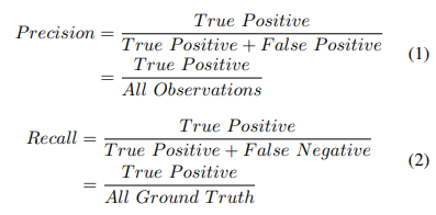 mAP(mean Average Precision). precision은 IoU를 기준으로 구해진다. IoU는 두 개의 영역이 겹치는 비율을 의미한다. 만약 예측한 영역과 실제 영역의 IoU가 사전에 정의한 임계값보다 크면 True Positive로 분류되고 그렇지 않으면 False Positive로 분류된다. 또한 모델이 객체가 존재하는데 찾아내지 못하면 False Negative로 분류된다.