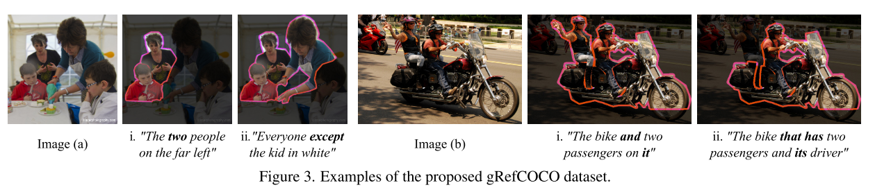 - More complex relationships : 다중 객체 표현은 하나 이상의 대상을 포함하기 때문에 문장이 더 복잡해진다. 예를 들어 위 이미지의 (b)에서 “The bike and two passengers on it”, “The bike that has two passengers and its driver” 모두 “and”, “two passengers”를 포함하고 있지만 가리키는 대상 객체는 다르다. 따라서 이미지 속 객체들과 상호작용, 관계 구조를 깊이있게 이해해야 한다.