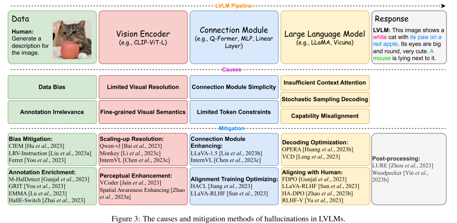 - LVLM에서 Hallucination은 다양한 원인으로부터 발생하는데, 밑의 파이프라인과 관련해서 나눌 수 있다.