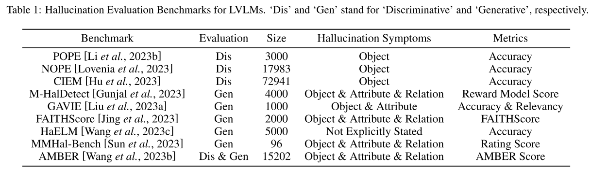 - 판별형 벤치마크가 객체 수준에서의 환각에 집중하는 반면, 생성형 벤치마크는 객체뿐만 아니라 속성(Attribute)과 관계(Relation)을 포함한 범위를 다룬다.