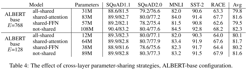- ALBERT-base 모델로 $E=768, 128$ 일 때 각각에 대하여 네 가지 공유 방식의 실험 결과를 보여준다.
