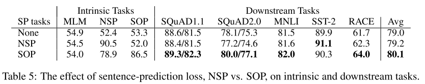 - 실험 결과에 따르면, NSP로 학습한 모델은 SOP를 거의 수행하지 못하나, SOP로 학습한 모델은 NSP도 비교적 잘 수행하는 것을 확인할 수 있다.