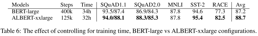 - 이전 비교에서 ALBERT-xxlarge가 BERT-large에 비해 약 3배 느린 것으로 측정이 됐는데, 이에 대해 학습 스텝을 고정하는 대신 시간을 고정하여 측정한다.