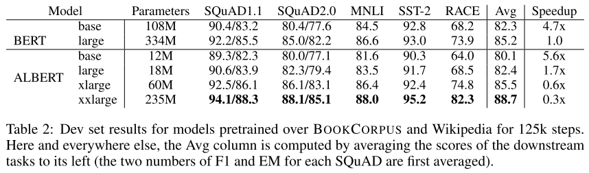 - ALBERT-xxlarge는 BERT-large의 약 70% 수준의 파라미터로 유의미한 성능 향상을 보여준다.