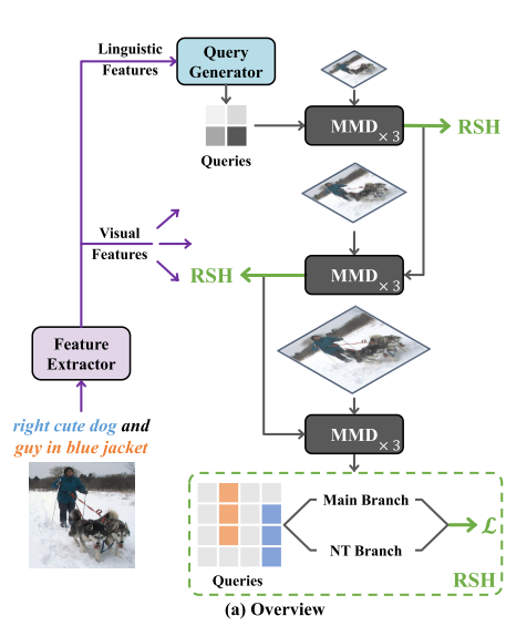 - Linguisitc Features는 Query Generator에 전달되어 Queries가 생성된다. 이후 MMD(MultiModel Decoder)와 Multi-Level Interactions, RSH(Region Supervision Head)를 거친다.