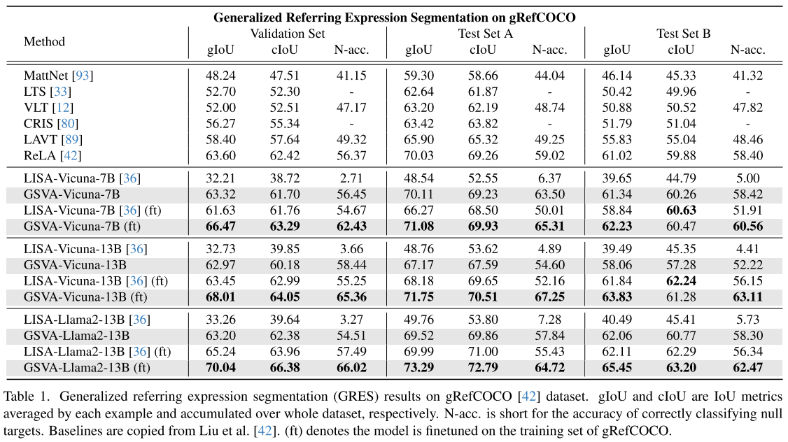 - 13B 모델의 최종 성능은 70.04, 66.38로, GRES 벤치마크에서 SOTA 성능을 달성하였다.