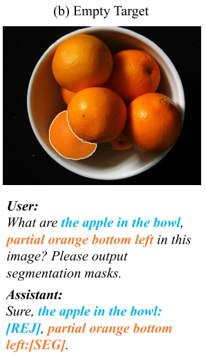 - [SEG] 토큰처럼, LLM은 객체와 토큰을 매핑해서 출력하게 된다. “Sure, {obj1}:[REJ], {obj2}:[REJ], {obj3}:[SEG].”