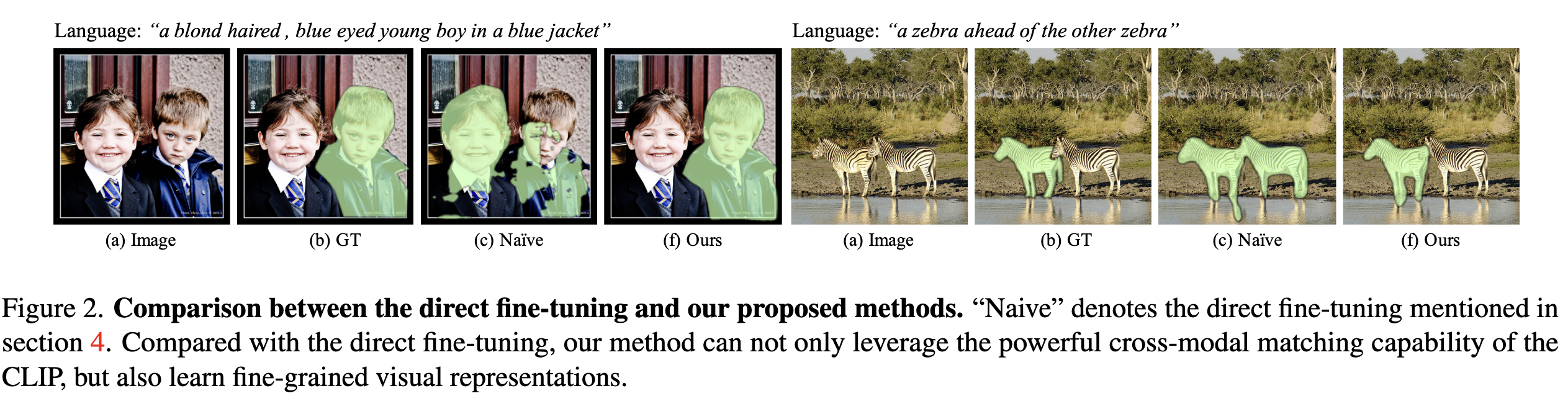 - 하지만 위 사진에서처럼, CLIP을 Naive하게 사용하는 방법으로는 최적의 성능을 내지 못하는데, 이유는 Pixel-level 예측 태스크인 RES와 다르게, CLIP은 Image-level(Contrastive)로 훈련되었기 때문이다.