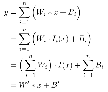 W' = \frac{\gamma}{\sqrt{\sigma + \varepsilon}}W, B' = \frac{(B-\mu)\gamma}{\sqrt{\sigma + \varepsilon}} + \beta