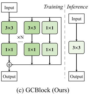 - 이런 이슈들을 해결하기 위해 Re-parameterization 기법을 사용하여 Multi-path 블럭을 추론 단계에서 하나의 컨볼루션 블럭으로 만드는 Golden Cudgel Network(GCNet)을 제안