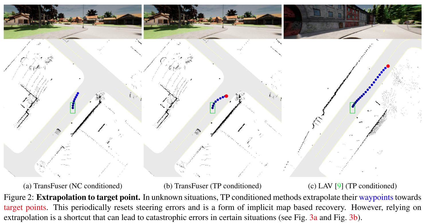 - 하지만 위 그림처럼 타겟 포인트가 현재 위치에서 멀리 떨어져 있을때는 그렇지 않다. 전문가의 Waypoint를 모방 학습한 두 모델 (a), (b) 모두 TP에 치우쳐진 출력을 내게되어 충돌이 발생할 수 있다. 논문에서는 이 현상을 A shortcut for recovery라고 부른다.